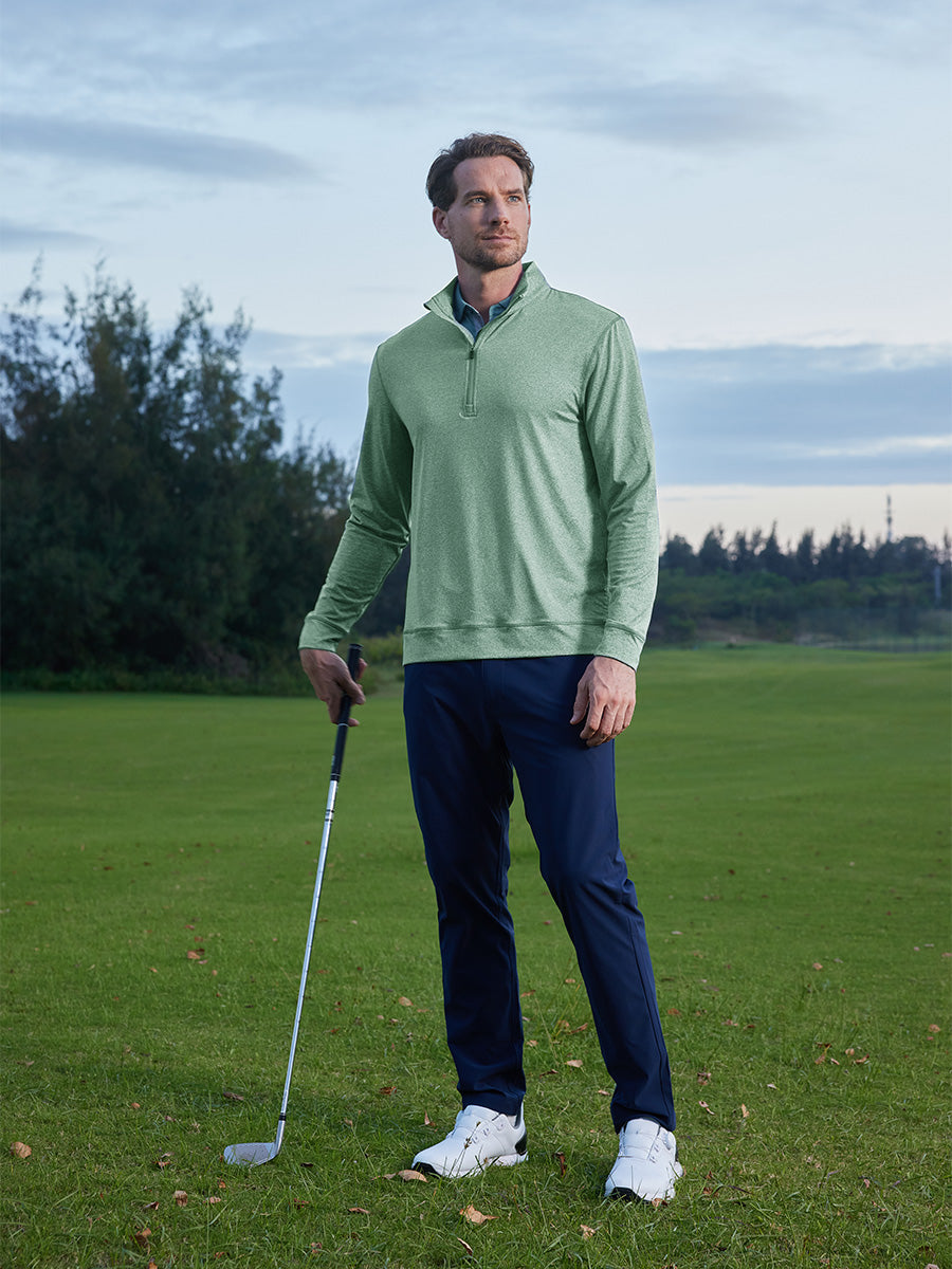 Meet our Quarter Zip Melange Pullover, the ultimate choice for golf aficionados. This men's sweatshirt is all about style and performance, featuring a sleek quarter zip placket with a windproof flap for that modern touch and easy temperature control. Crafted from a high-performance 4-way stretch brushed knit of polyester and spandex, it offers moisture-wicking, lightweight, and breathable comfort, ensuring you move with ease and style on the golf course. Elevate your game with comfort and sophistication!