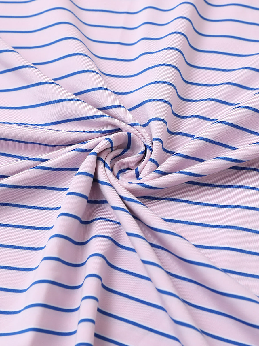 Experience lightweight comfort with moisture-wicking, quick-dry properties, and four-way stretch for enhanced movement. Our men's golf shirt showcases horizontal stripes in two-tone knit, accented by a striking contrast design at the collar and slits, achieving a stylish, unique, and elegant appearance.