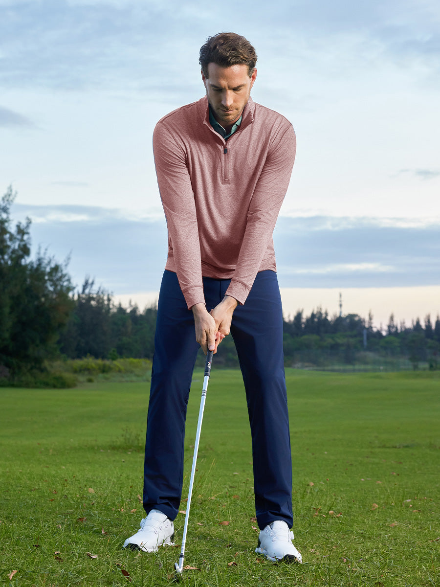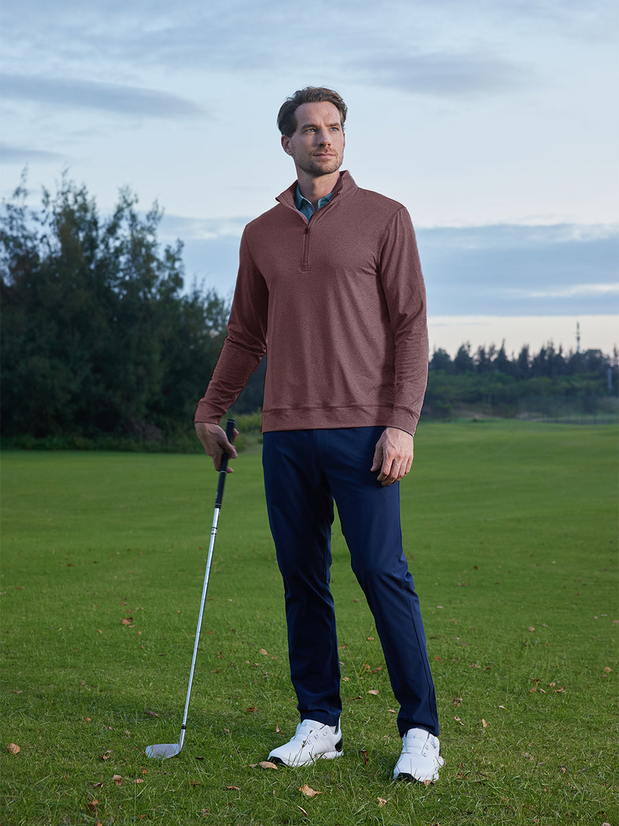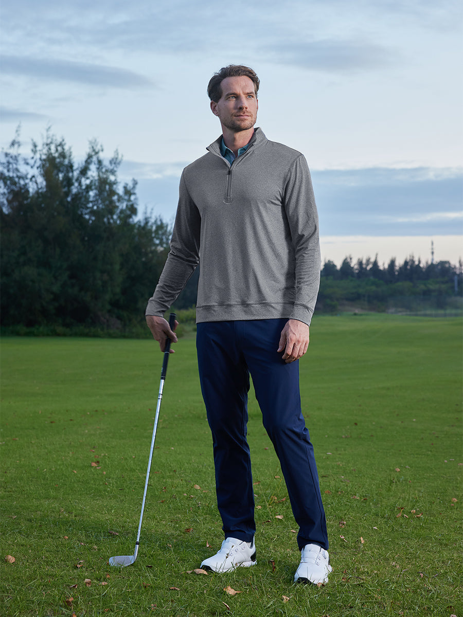Meet our Quarter Zip Melange Pullover, the ultimate choice for golf aficionados. This men's sweatshirt is all about style and performance, featuring a sleek quarter zip placket with a windproof flap for that modern touch and easy temperature control. Crafted from a high-performance 4-way stretch brushed knit of polyester and spandex, it offers moisture-wicking, lightweight, and breathable comfort, ensuring you move with ease and style on the golf course. Elevate your game with comfort and sophistication!